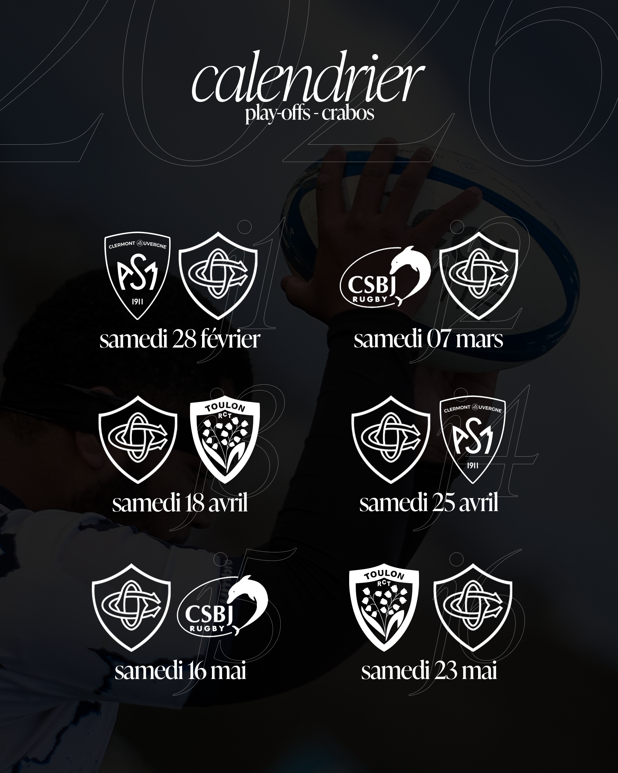 Nos Crabos, qui affronteront Clermont, Bourgoin et Toulon, entameront cette seconde phase de la compétition en se déplaçant à Clermont le samedi 28 février.