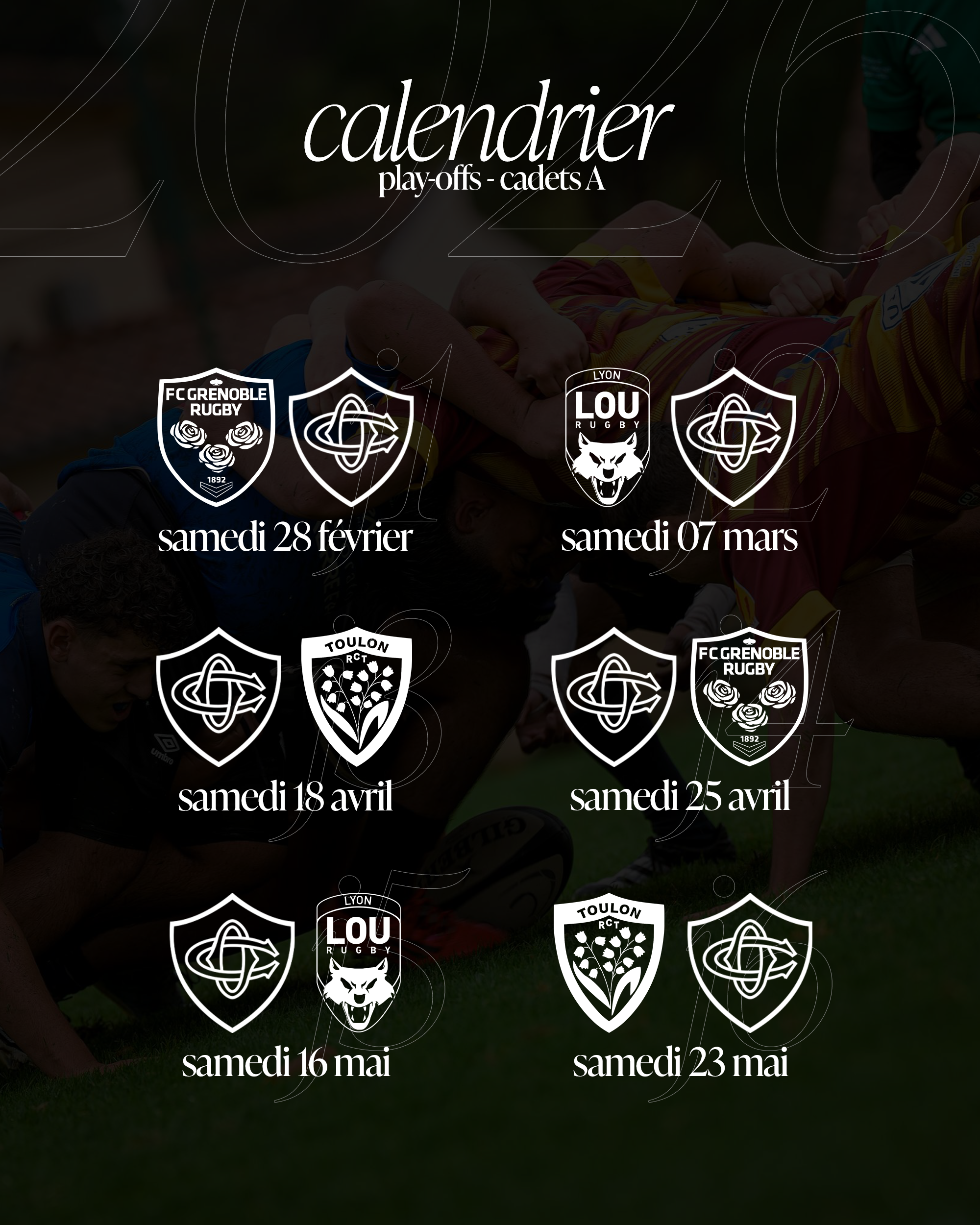 Nos Cadets A débuteront également le samedi 28 février par une rencontre à l’extérieur face à Grenoble. Ils poursuivront ensuite en affrontant le LOU et Toulon.