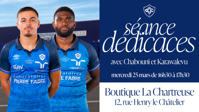 Vuate Karawalevu et Théo Chabouni seront ce mercredi après-midi, 25 mars, de 16h30 à 17h30, en séance de dédicaces à la boutique du Castres Olympique de Melou (12 rue Henry le Chatelier, à Castres). On vous y attend nombreux!