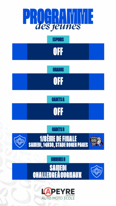 Découvrez ci dessous les différents matchs du week-end de nos jeunes avec notamment le 1/8ème pour nos Cadets B !