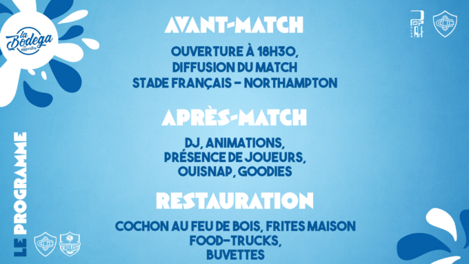 Venez dès 18h30 en passant votre avant match à la bodega des supporters. Au programme notamment la diffusion du match Stade Français/Northampton. Sur place vous aurez de quoi savourez de délicieux petits plats avec Marée Hot ainsi que de quoi vous désaltérer.